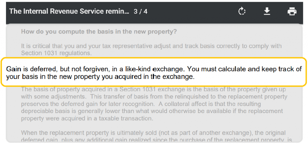 In short, the IRS says “As long as you keep using real estate productively, we’re not going to punish you by levying taxes.”